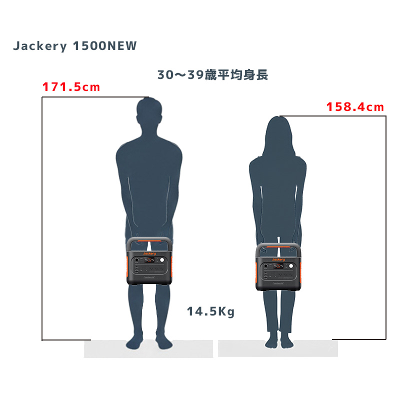 まず最初に、Jackery 1500NEWを持ち運ぶときのサイズ感が分かる画像を用意しました。こちらは、30~39歳の平均的な身長の男女が、Jackery 1500NEWを両手で持った時のイメージです。