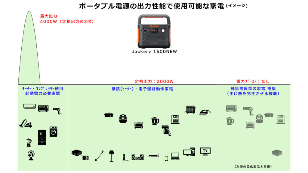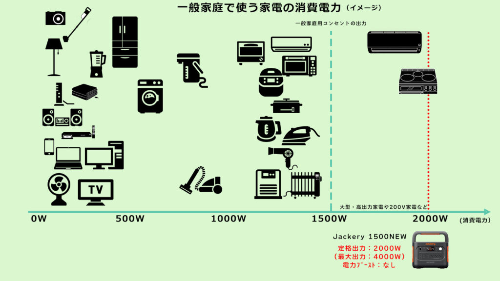 ① 一般家庭で使う家電の消費電力(イメージ)とJackery 1500NEWの定格出力