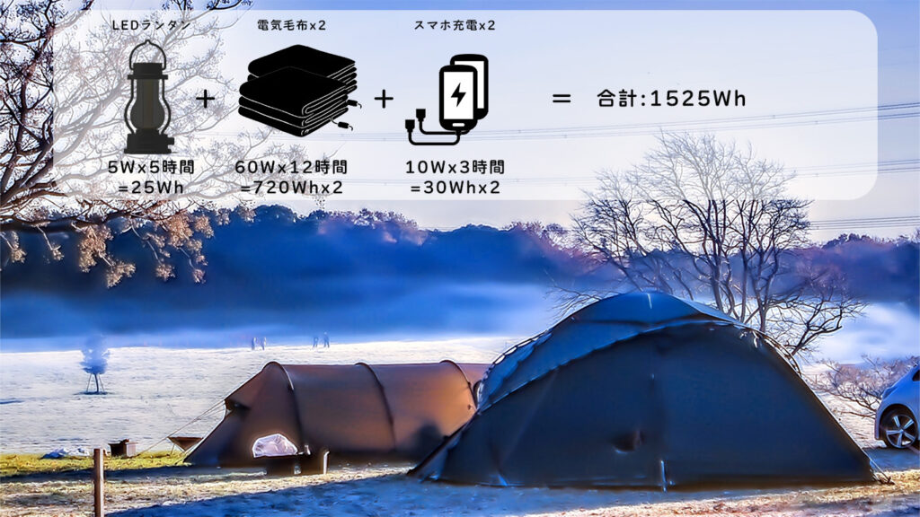 | 電気毛布(60W) | 2人分 | 12時間 | 720Whx2 | ||