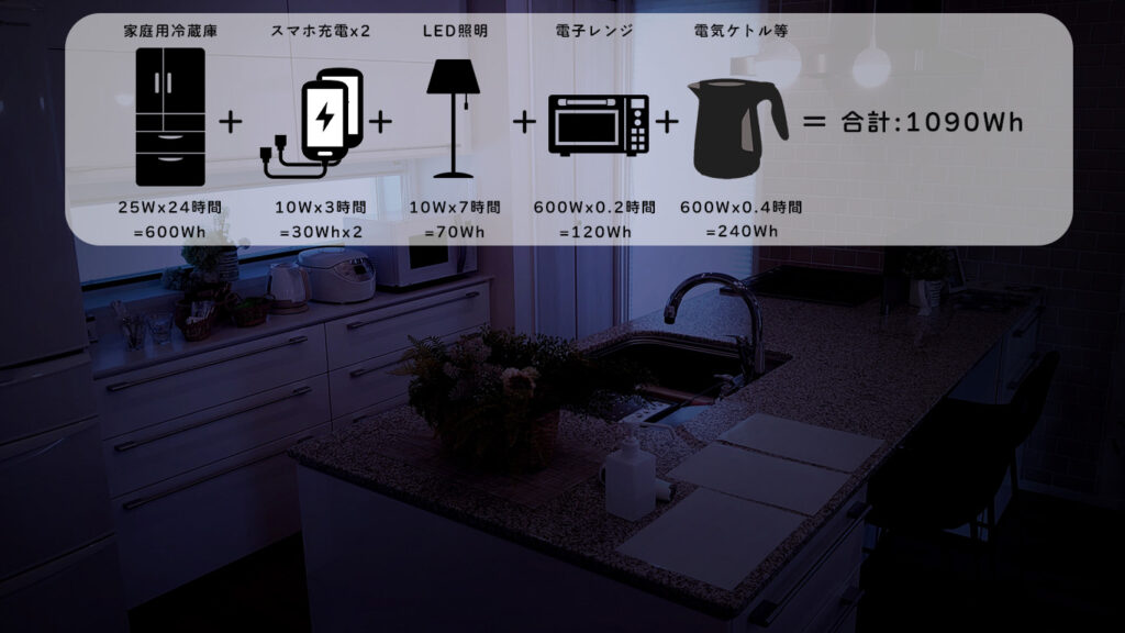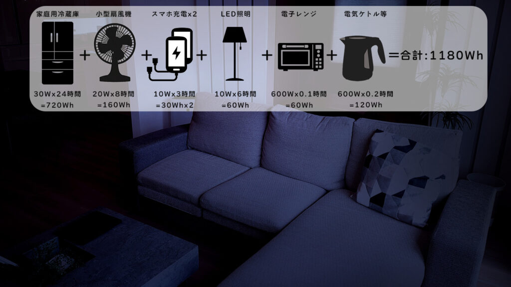 | 春夏 | 家庭用冷蔵庫(30W) | 共用 | 24時間 | 720Wh | 1180Wh |