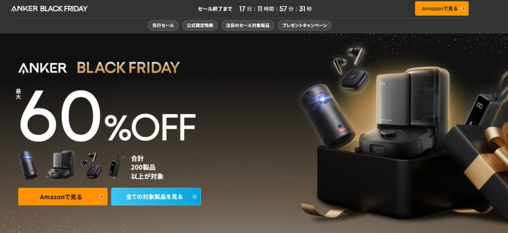 アンカー公式オンラインストアでは12月1日まで、Black Fridayセール開催中です。