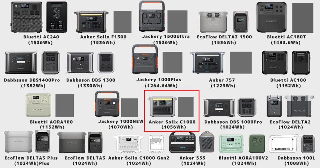 ① Anker Solix C1000と容量1000Wh台ポータブル電源の「サイズ」比較