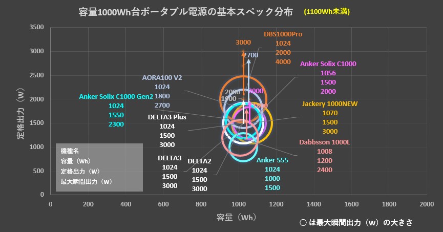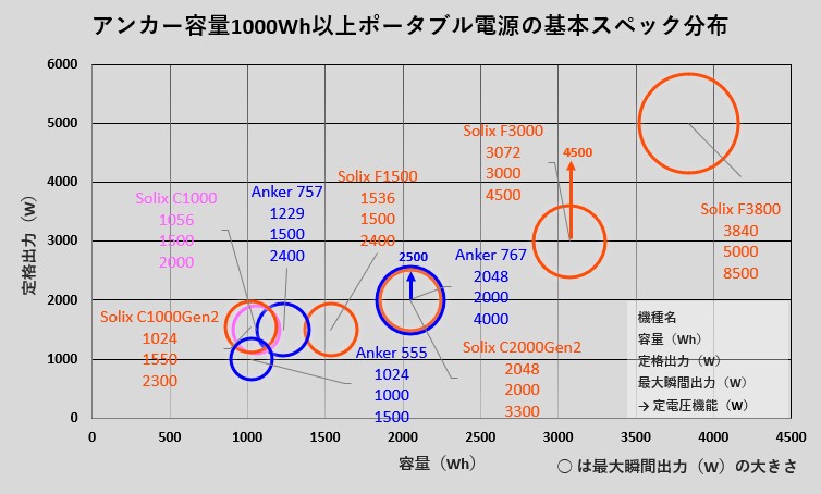 こちらのグラフは、アンカーの大容量(容量1000Wh以上)ポータブル電源の容量・出力を視覚的に比較したものです。