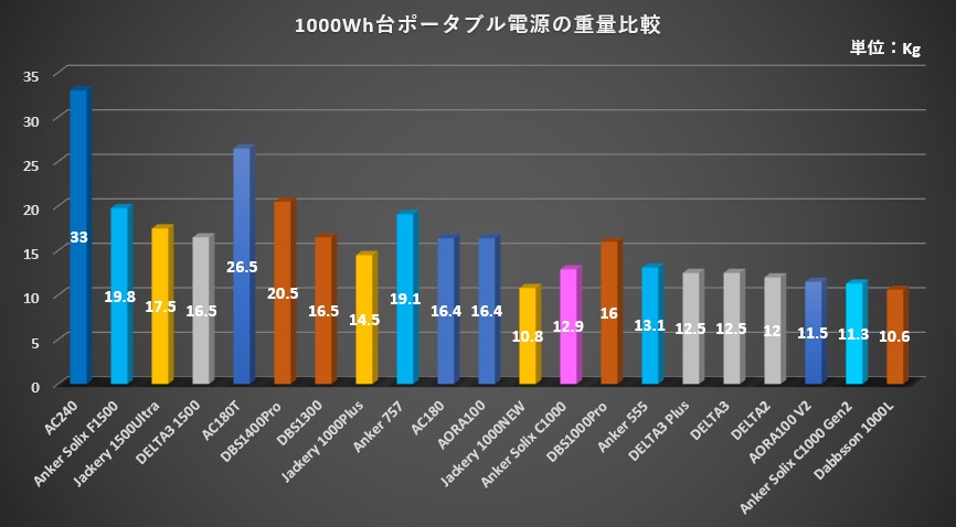 ① Anker Solix C1000と、容量1000Wh台ポータブル電源の「重量」比較