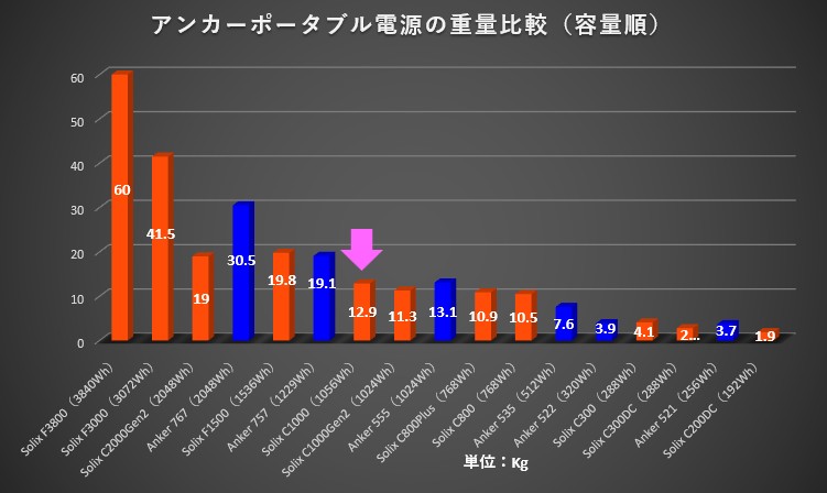 2) Anker Solix C1000と、他ポータブル電源の「重量」比較