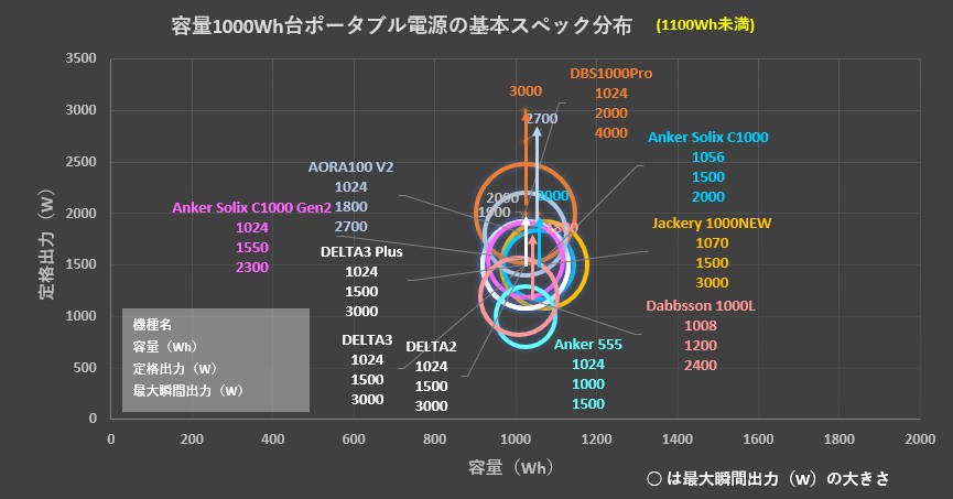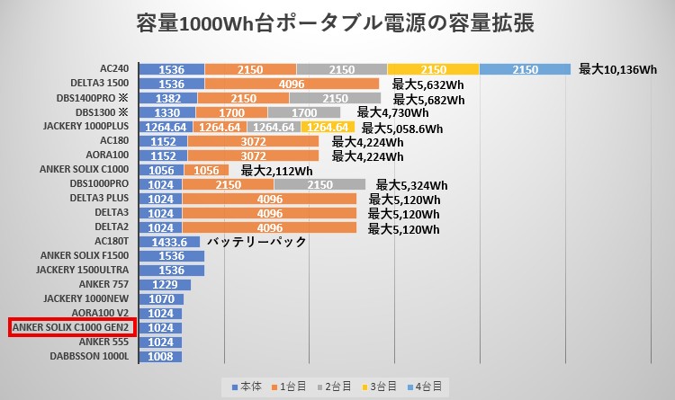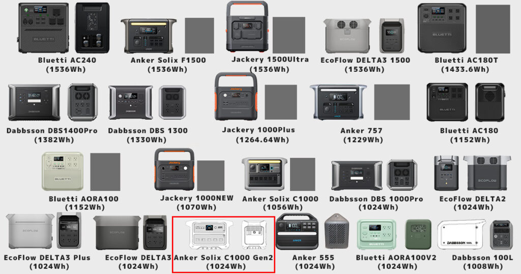 Anker Solix C1000 Gen2と同じ容量(1024Wh)のポータブル電源は7モデルあります。