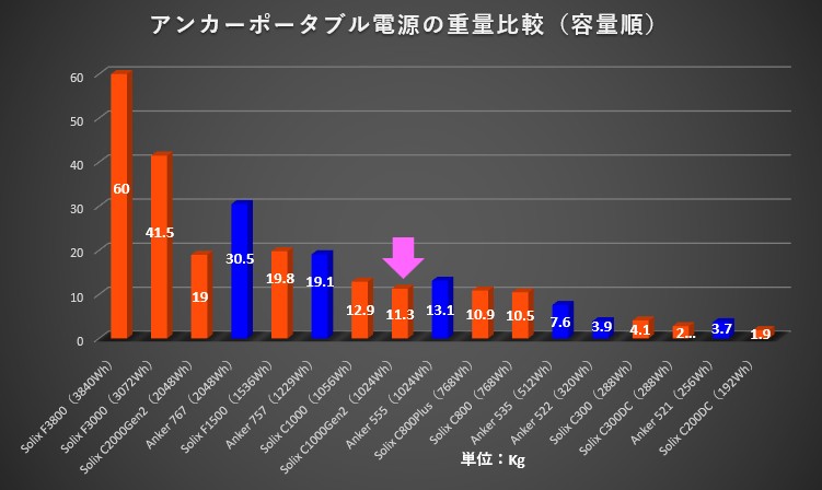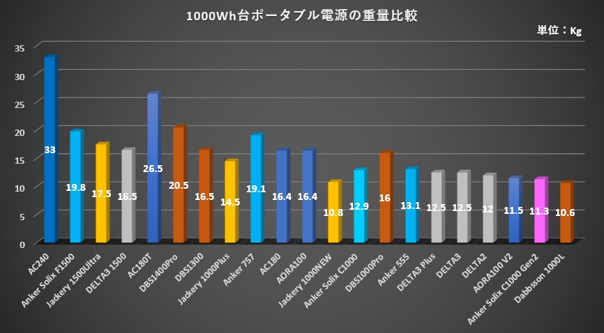 ① Anker Solix C1000 Gen2と、容量1000Wh台ポータブル電源の「重量」比較