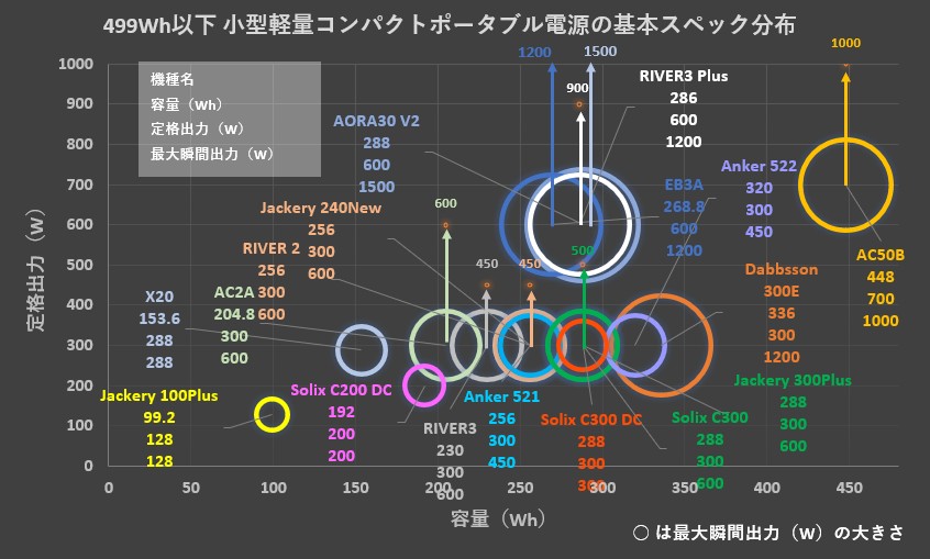 AC/DC共に使える一般的なポータブル電源とDC出力専用モデルを分けた上で、左上から容量(Wh)が大きい順に並べています。