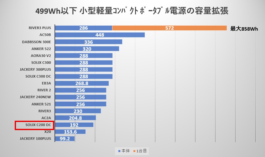 ① Anker Solix C200DCと容量499Wh以下ポータブル電源の「サイズ」比較