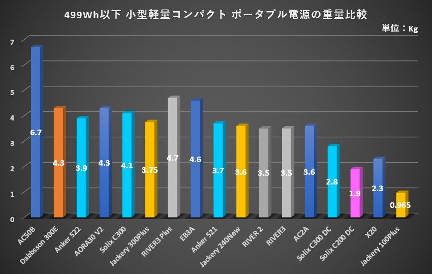 ① Anker Solix C200DCと、容量499Wh以下ポータブル電源の「重量」比較
