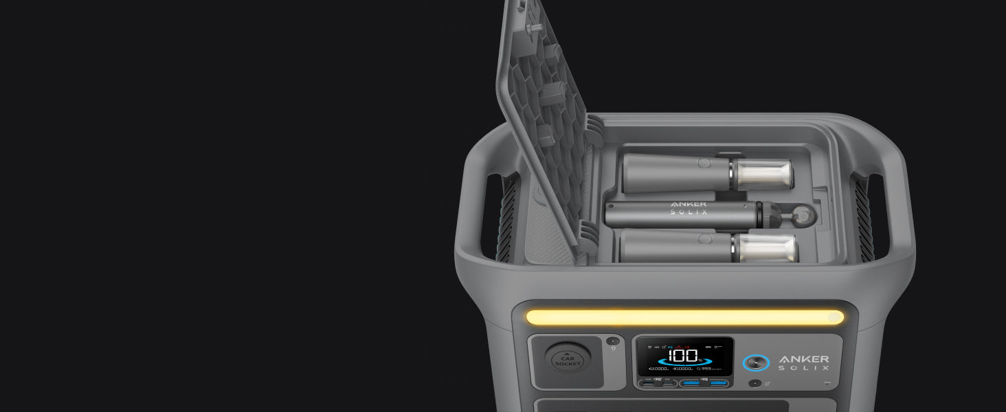 Anker Solix C800は、天面の蓋を開けると収納スペースになっており、紛失しがちな充電ケーブル等の小物の保管に便利です。Anker Solix C800Plusは、Plusその収納スペースにキャンプライト二つと最大100cmまで伸縮可能なポールが付属しています