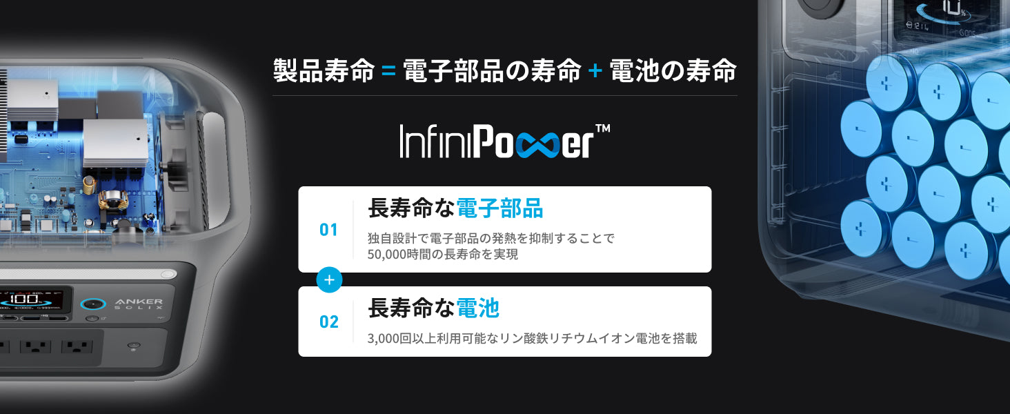 Anker Solix C800/800Plusは、電池寿命と電子部品寿命を両立させ「毎日、10年使える」長寿命設計が特徴です。EVクラスのリン酸鉄リチウムイオン電池と独自技術による電子部品の長寿命化により、3,000回以上の充放電サイクルと約50,000時間の電子部品寿命を実現しています