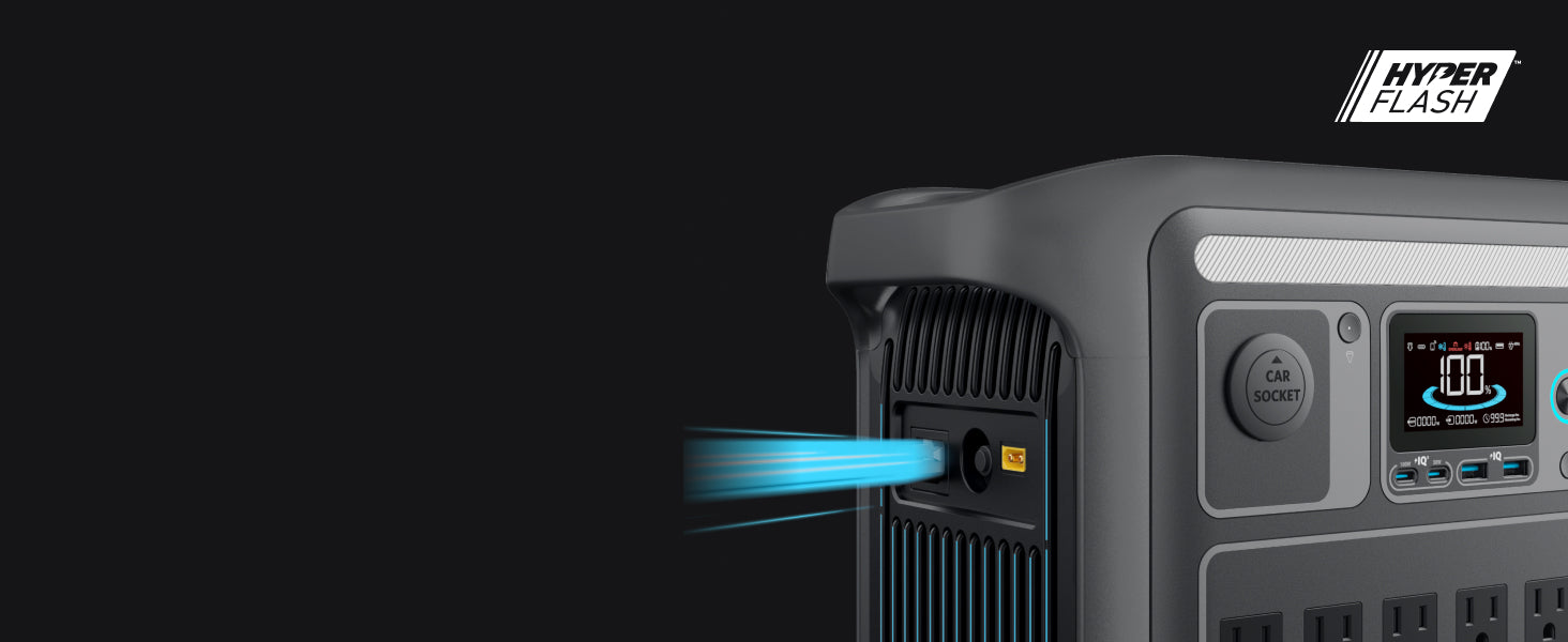 EVクラスのリン酸鉄リチウムイオン電池を搭載し、Anker独自の急速充電技術「HyperFlash™」により、わずか58分で100%満充電が完了します。