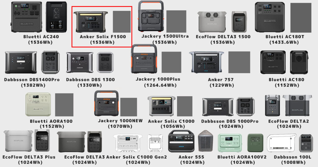 ① Anker Solix F1500と容量1000Wh台ポータブル電源の「サイズ」比較