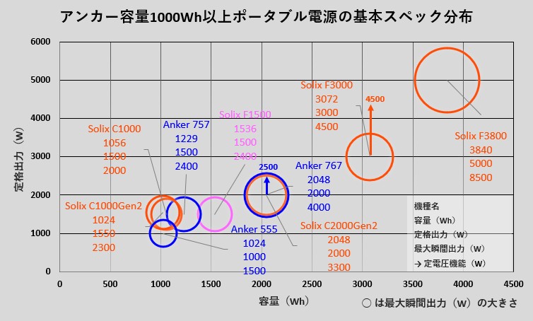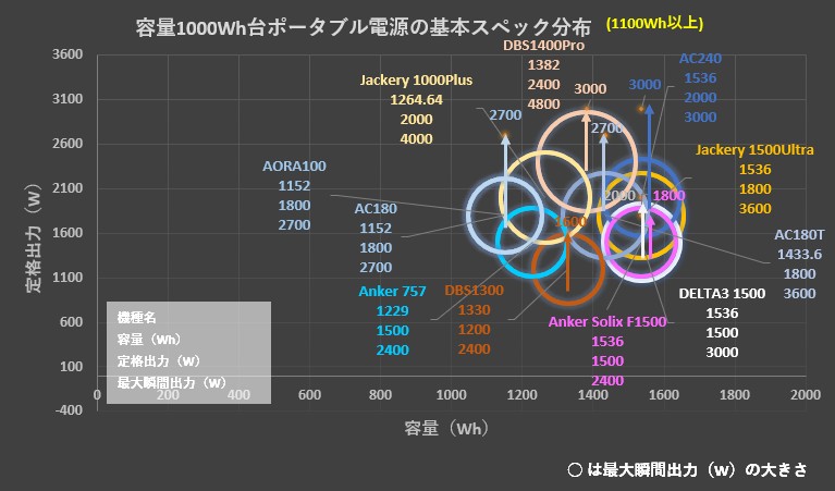 こちらのグラフは、アンカーの大容量(容量1000Wh台)ポータブル電源の容量・出力を比較したものです。