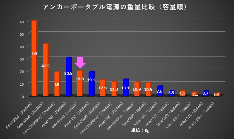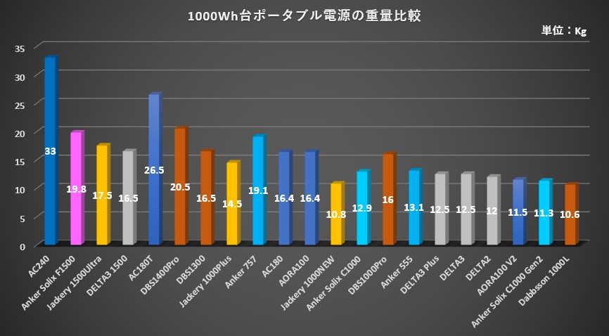 ① Anker Solix F1500と、容量1000Wh台ポータブル電源の「重量」比較