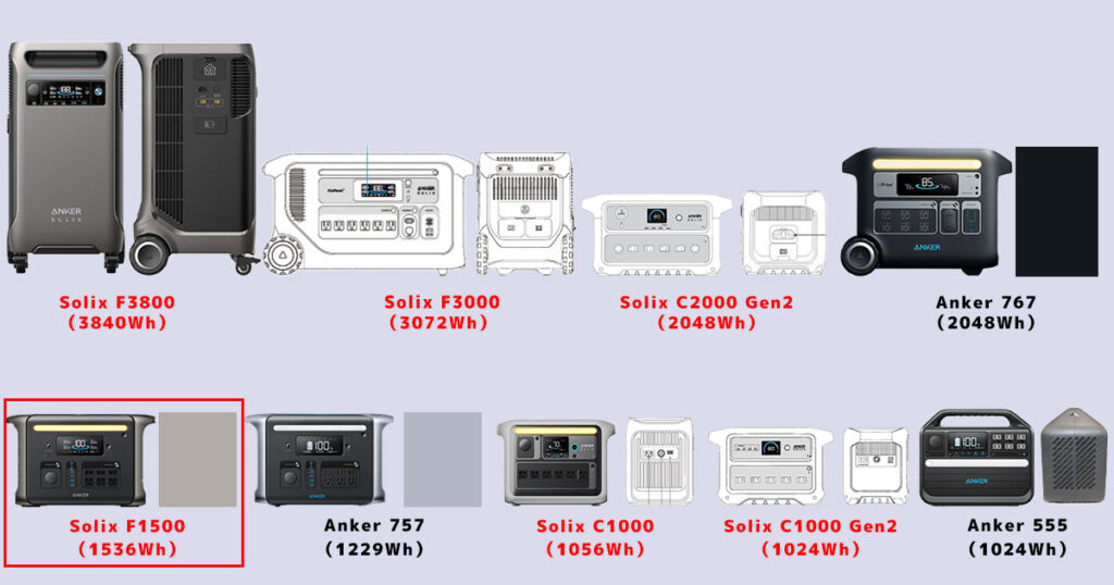 ② Anker Solix F1500と、他アンカー大容量(1000Wh台)ポータブル電源の「サイズ」比較