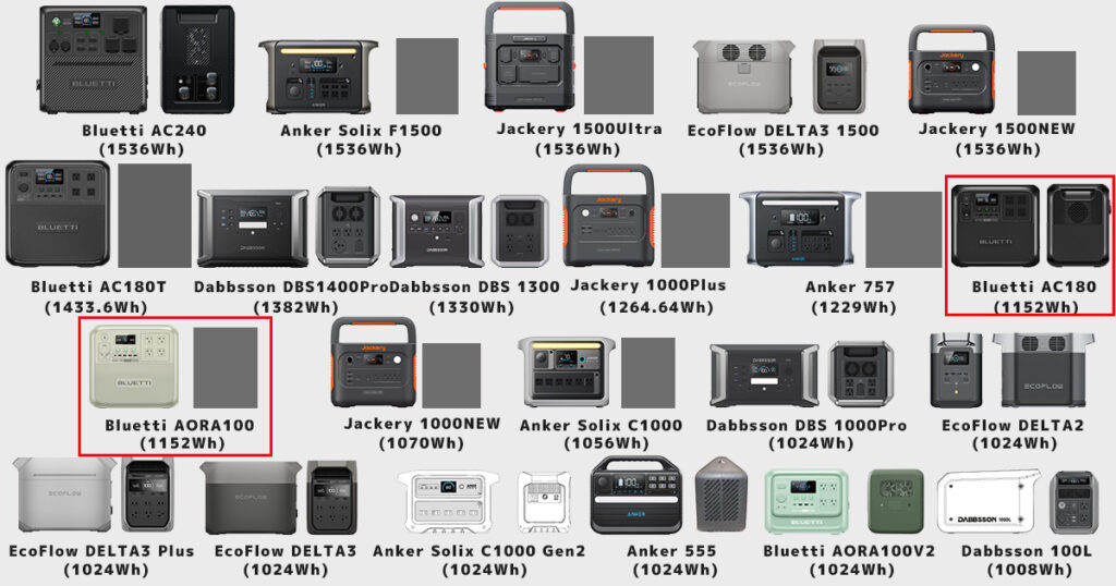 【容量1000Wh台のポータブル電源 サイズ比較】 Bluetti AC180は表中のNo.11、AORA100はNo.12
