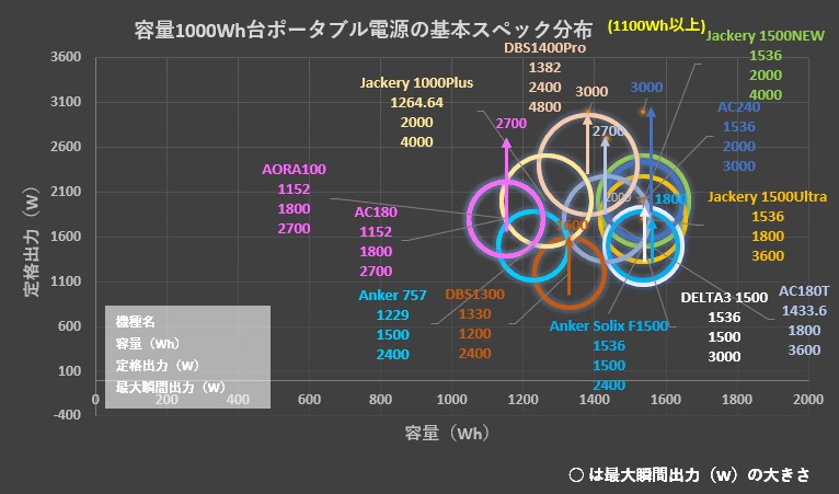 上の比較表では、容量1000Wh台のポータブル電源の、発売日、バッテリーの種類、容量、定格出力、最大出力、電力ブースト機能、拡張バッテリーの有無と最大容量、通常価格、そして1Whあたりの単価などを比較できます。