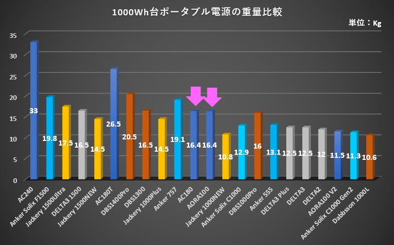 上のグラフは、容量1000Wh台のポータブル電源の重量(Kg)を、容量の大きい順に並べて比較したものです。