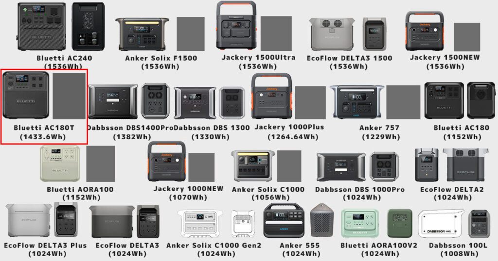 ① Bluetti AC180Tと容量1000Wh台ポータブル電源の「サイズ」比較