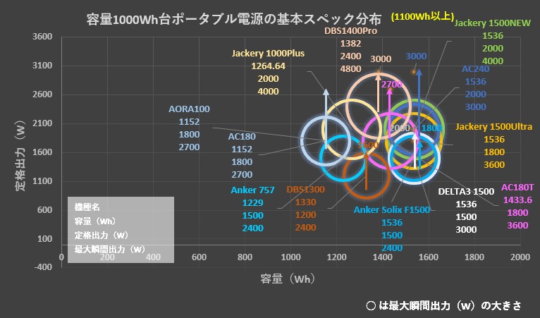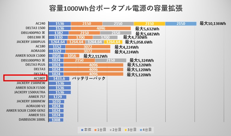上のグラフは、容量1000Wh台のポータブル電源が持つ拡張性を比較したものです。