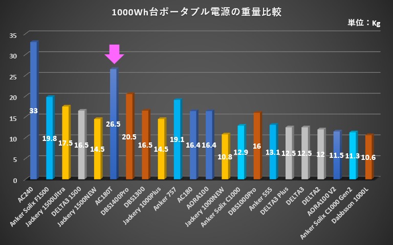 上のグラフは、容量1000Wh台のポータブル電源の重量(Kg)を、容量の大きい順に並べて比較したものです。