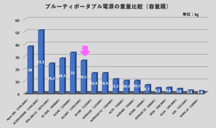 ① Bluetti AC180Tと、容量1000Wh台ポータブル電源の「重量」比較