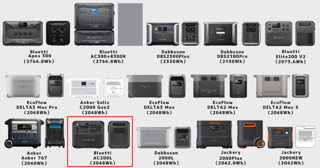 ① Bluetti AC200Lと容量2000Wh台ポータブル電源の「サイズ」比較