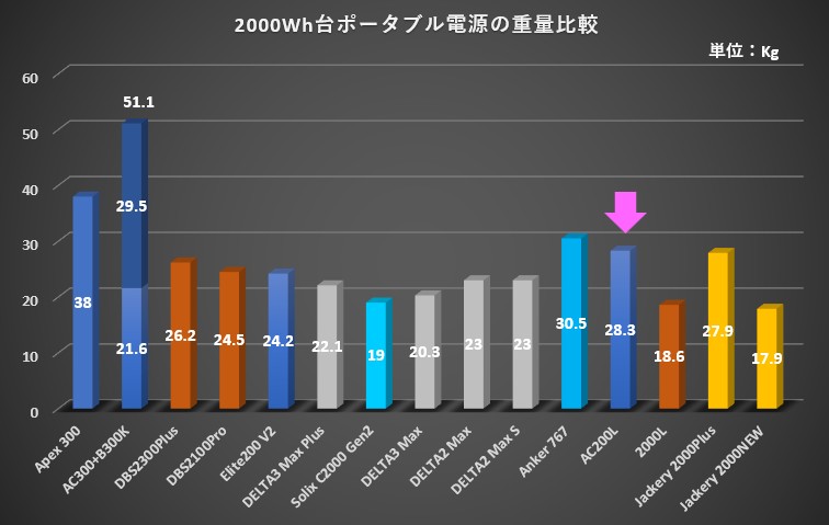 と、容量2000Wh台ポータブル電源の「重量」比較