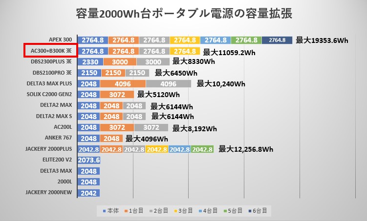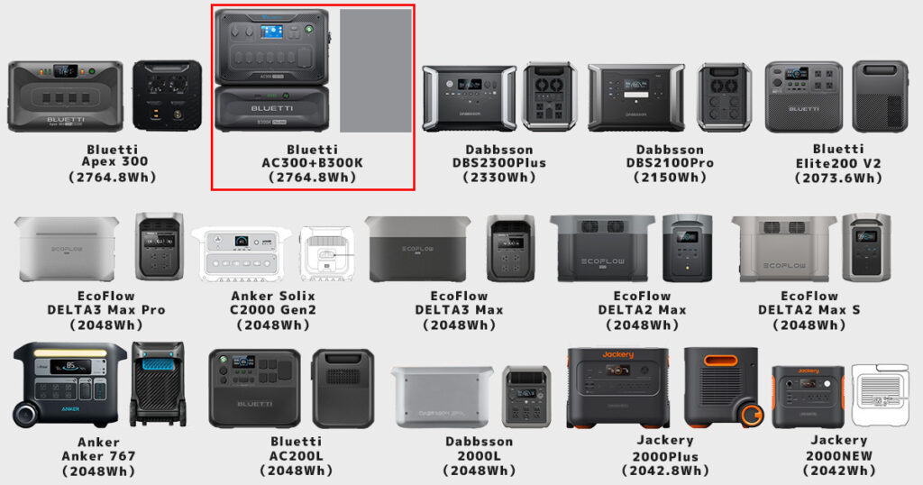 ① Bluetti AC300+B300Kと容量2000Wh台ポータブル電源の「サイズ」比較