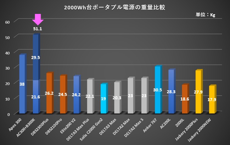 ピンク色で示されているの、Bluetti AC300+B300Kは、その重さが群を抜いています。