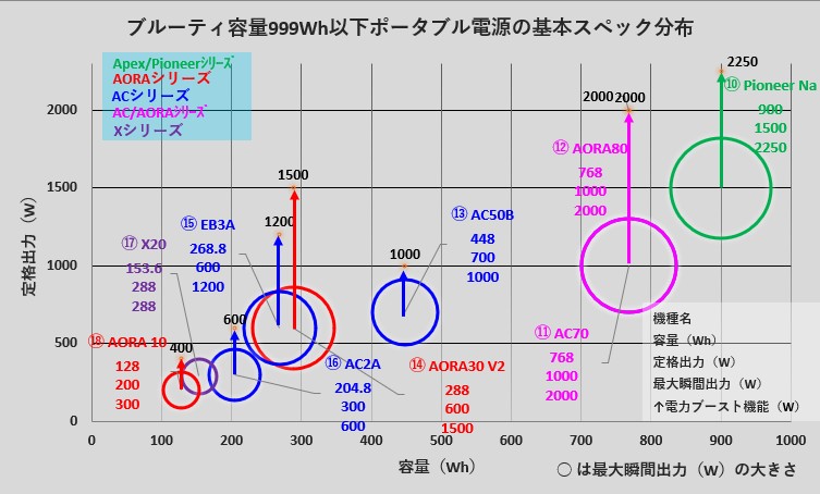 ② Bluetti Pioneer Naと、他ブルーティ中~小容量(999Wh以下)ポータブル電源の「サイズ」比較