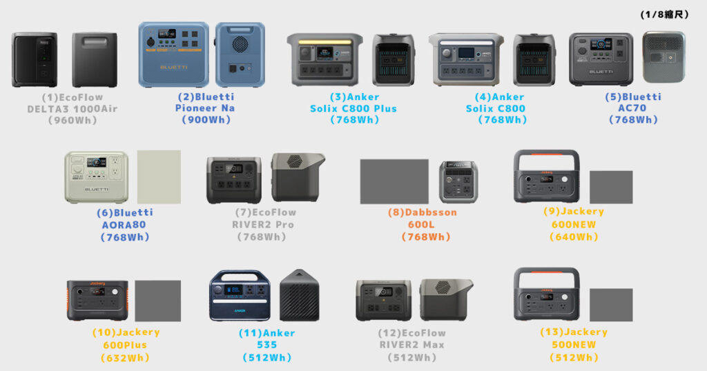Anker、Bluetti、Dabbsson、EcoFlow、Jackeryといった人気メーカー5社の製品が、1/8の縮尺で並べられています。