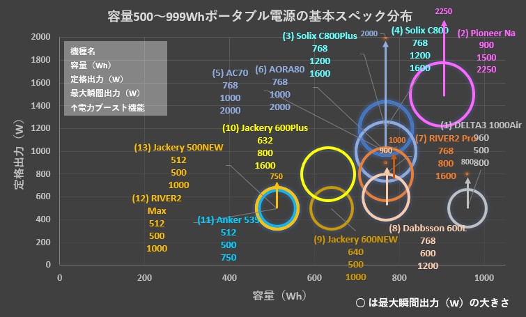 【容量500~999Whのポータブル電源 サイズ比較】 Bluetti Pioneer Naは表中のNo.2