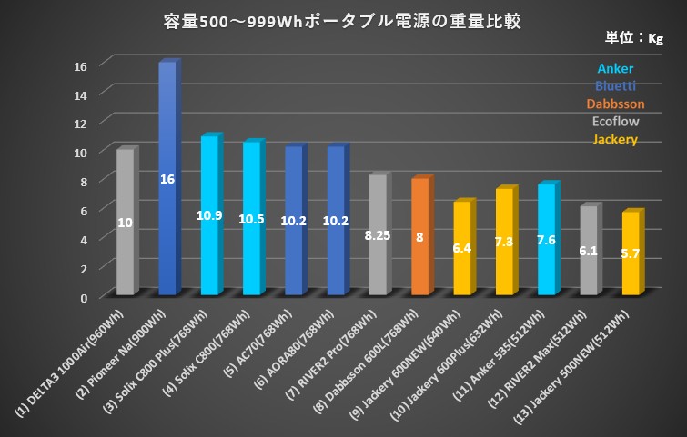 上のグラフは、容量500~999Whのポータブル電源の重量(Kg)を、容量の大きい順に並べて比較したものです。