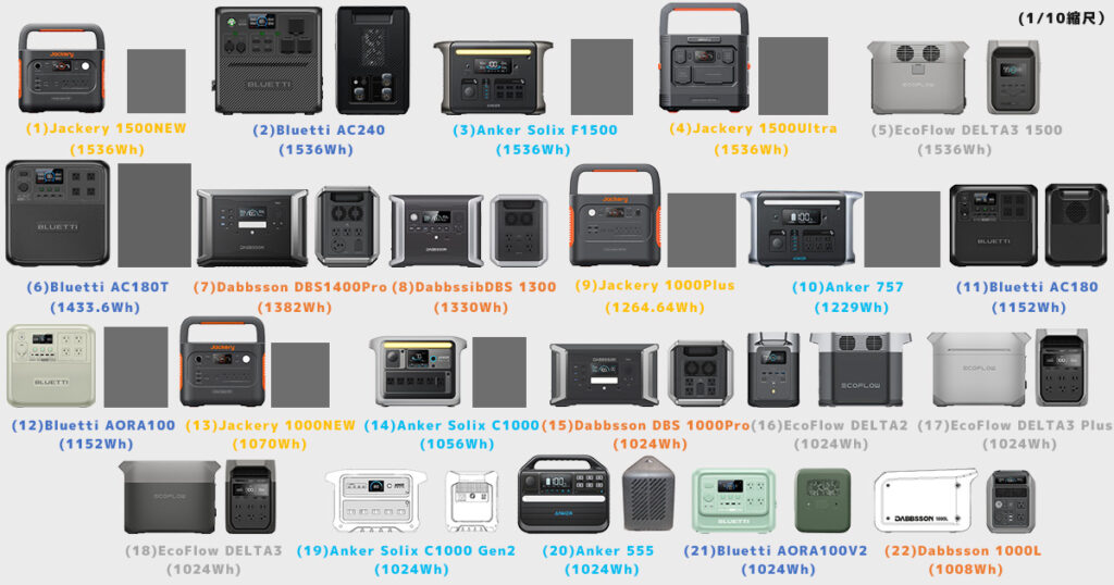 ① Dabbsson DBS1300と容量1000Wh台ポータブル電源の「サイズ」比較