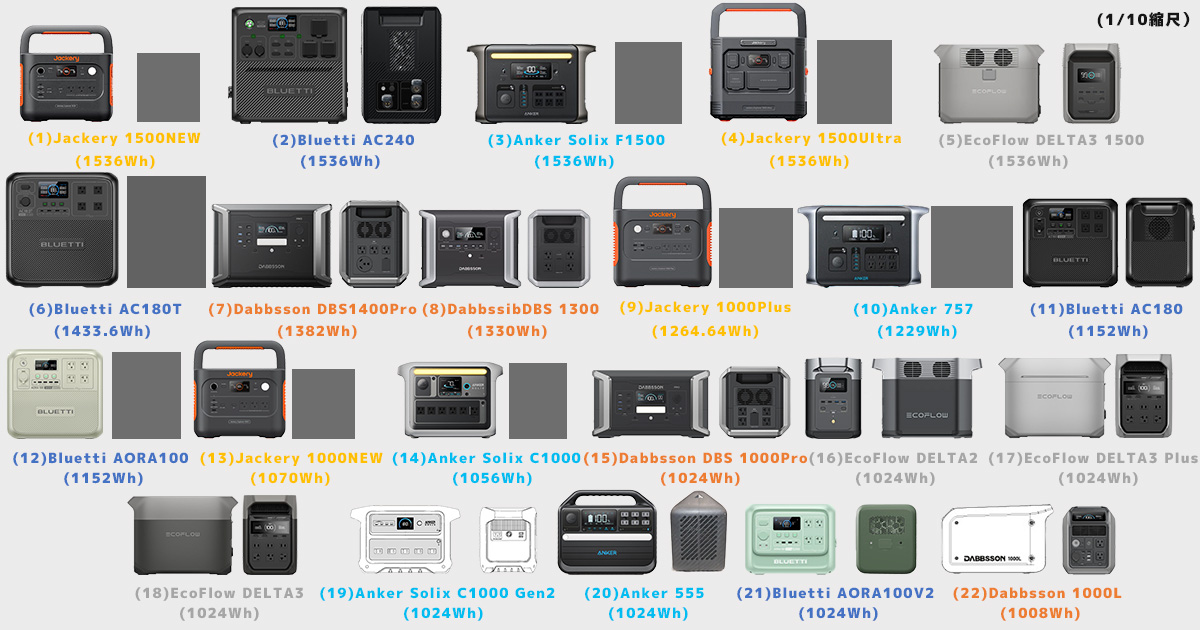 Anker、Bluetti、Dabbsson、EcoFlow、Jackeryといった人気メーカー5社の製品が、1/10の縮尺で並べられています。
