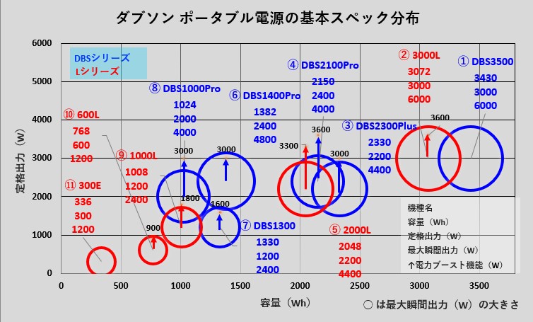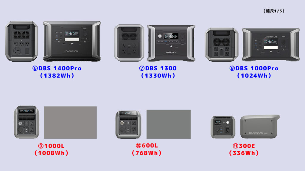 ② Dabbsson DBS1300と、他ダブソン 容量1400Wh以下ポータブル電源の「サイズ」比較