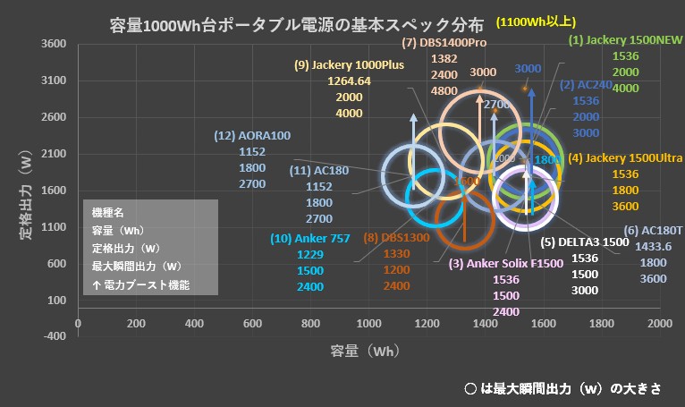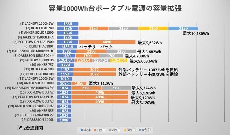 上のグラフは、容量1000Wh台のポータブル電源の拡張性を比較したものです。