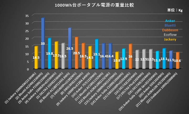 上のグラフは、容量1000Whクラスのポータブル電源の重量(Kg)を、容量の大きい順に並べて比較したものです。