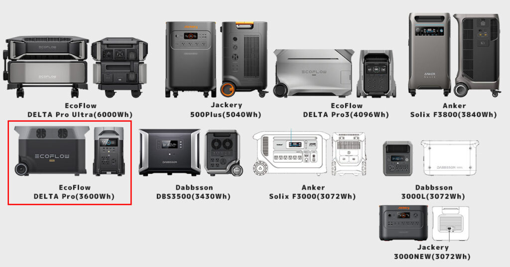 ① EcoFlow DELTA Proと容量3000Wh以上ポータブル電源の「サイズ」比較