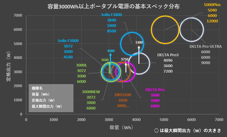 そして、円の大きさは最大瞬間出力(W)を示しており、起動時に大きな電力を必要とする電化製品を使用できるかどうかの指標となります。