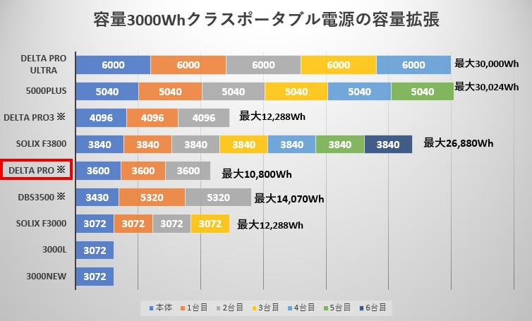 拡張バッテリー (最大容量) | 30,000Wh | 30,240Wh | 12,288Wh※ | 26,880Wh | 10,800Wh※ | 14,070Wh※ | 12,288Wh | なし | なし |