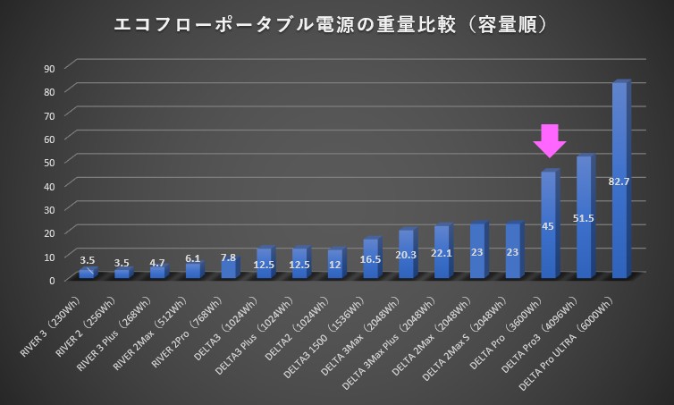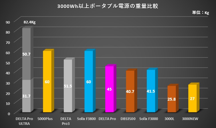 ① EcoFlow DELTA Proと、容量3000Wh以上ポータブル電源の「重量」比較
