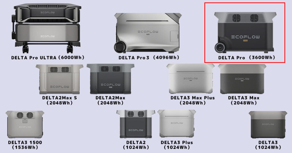 EcoFlow DELTA Pro(容量3600Wh)は、DELTA Pro3(容量4096Wh)とDELTA2 MaxS(容量2048Wh)の間の容量を持っています。
