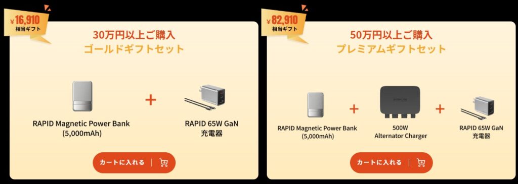 ・ただし、EcoFlowのセールでは、小型ポータブル電源やソーラーパネル、専用バッグなどの「無料ギフト」が提供される商品が頻繁に登場します