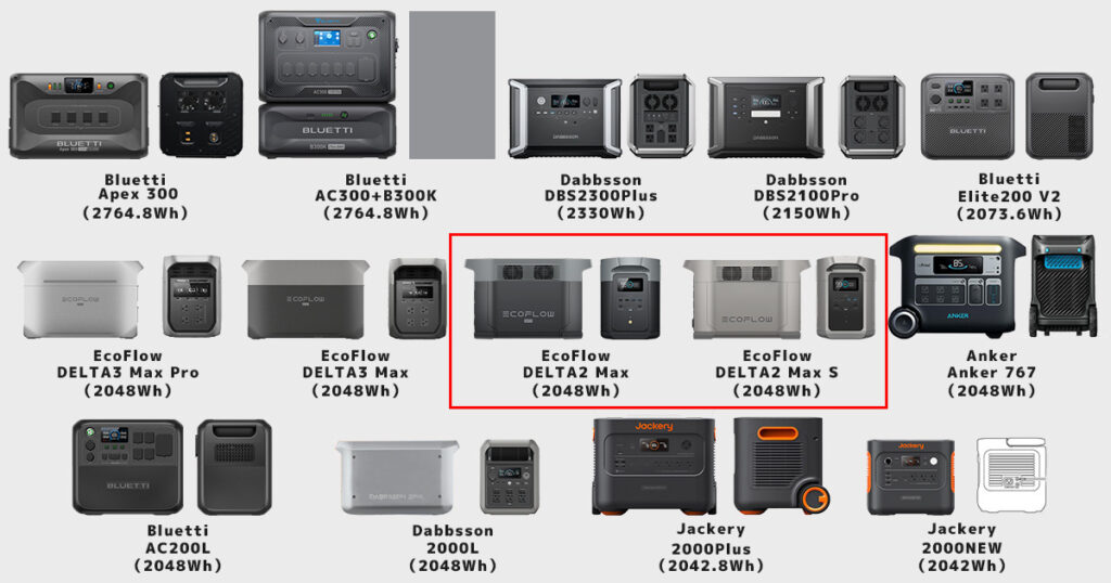 ① EcoFlow DELTA2 Max/DELTA2 Max Sと容量2000Wh台ポータブル電源の「サイズ」比較