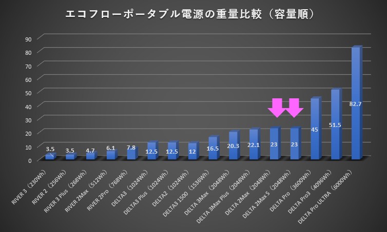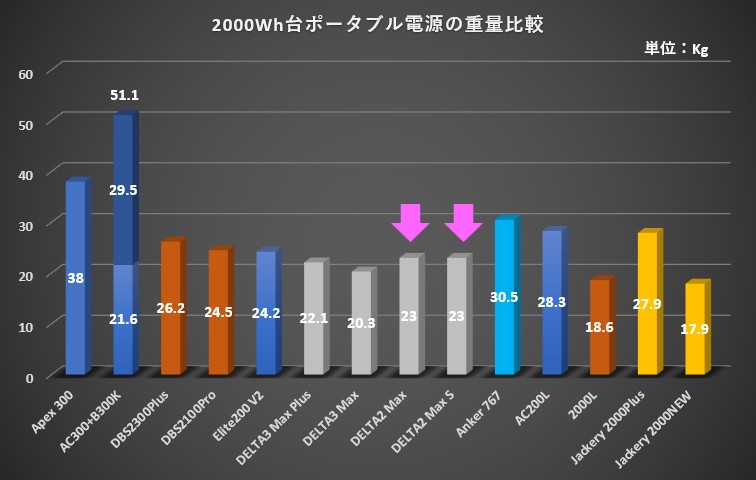 ① EcoFlow DELTA2 Max/DELTA2 Max Sと、容量2000Wh台ポータブル電源の「重量」比較