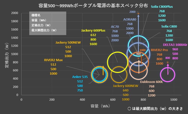 この記事では、容量960Whの EcoFlow DELTA3 1000Air を「500~999Whクラス」として比較しています。